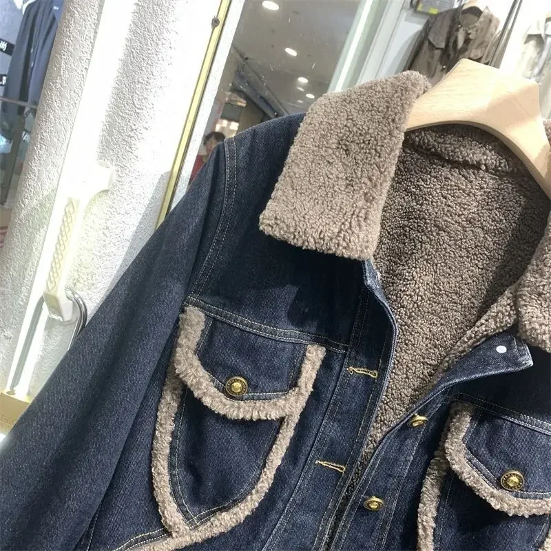 Women's Fur Plush Denim Jacket - Padded Short Winter Coat